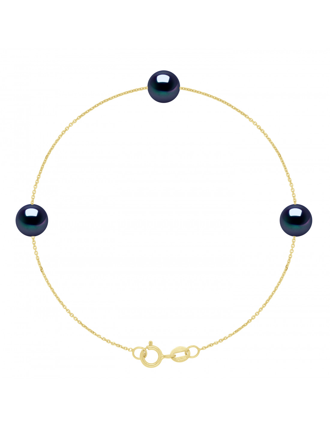 Bracelet 3 Perles de Culture d'Eau Douce Rondes 7-8 mm Chaîne Forçat Diamantée Petit Modèle Or 375 Millièmes